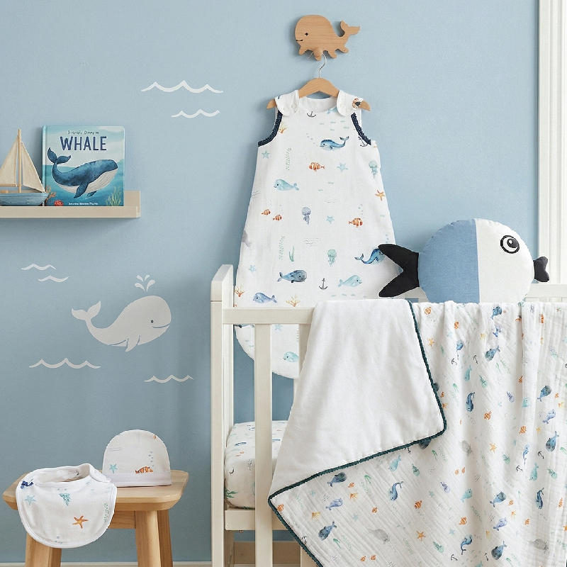 A soothing bedding and sleeping set inspired by gentle ocean elements, designed to create a calm and comfortable sleep environment for babies. Featuring soft aquatic prints and coordinated essentials, it brings a fresh and serene touch to nursery spaces.