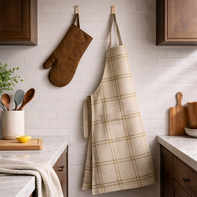 Essential kitchen textiles designed for protection, comfort, and everyday functionality. Combining durable fabrics with clean aesthetics for a modern cooking environment.
