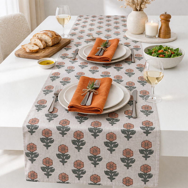 Elegant table runners designed to elevate dining spaces with subtle prints and refined textures. A perfect blend of functionality and decorative appeal for modern table settings.