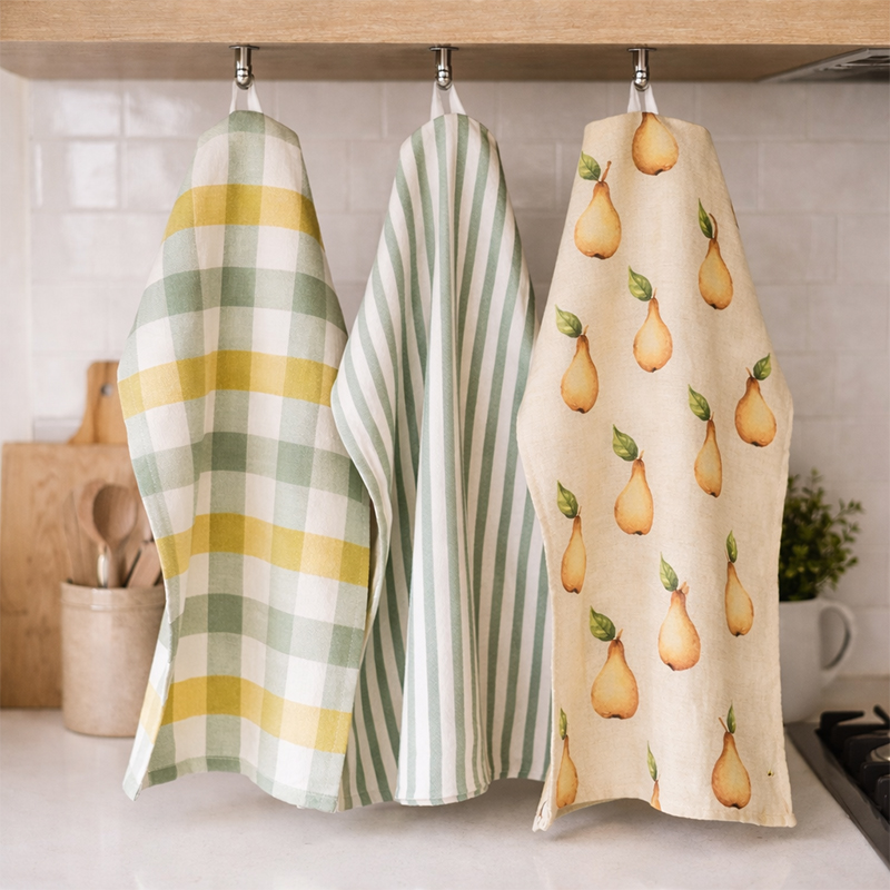 A versatile range of kitchen towels combining terry, printed, and check designs—crafted for efficient everyday use while enhancing the visual appeal of modern kitchen spaces.