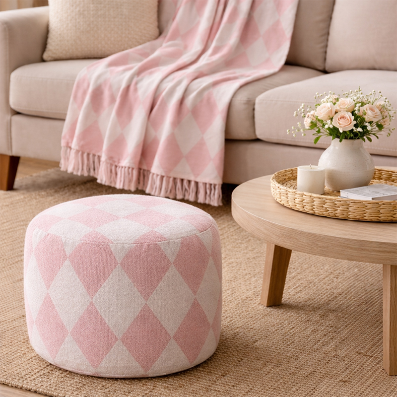 Coordinated pouffe and throw set designed to add comfort, warmth, and visual harmony to living spaces. Featuring soft textures and subtle patterns, they create a cosy, inviting atmosphere.