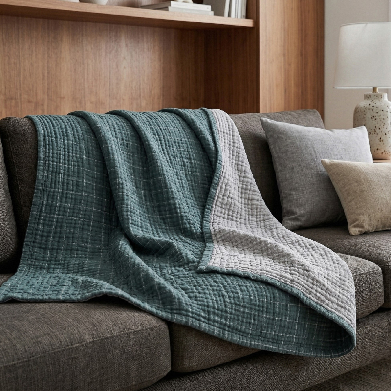A soft, double-layered cotton throw featuring a subtle textured weave, designed to bring warmth, comfort, and understated elegance to modern living spaces.