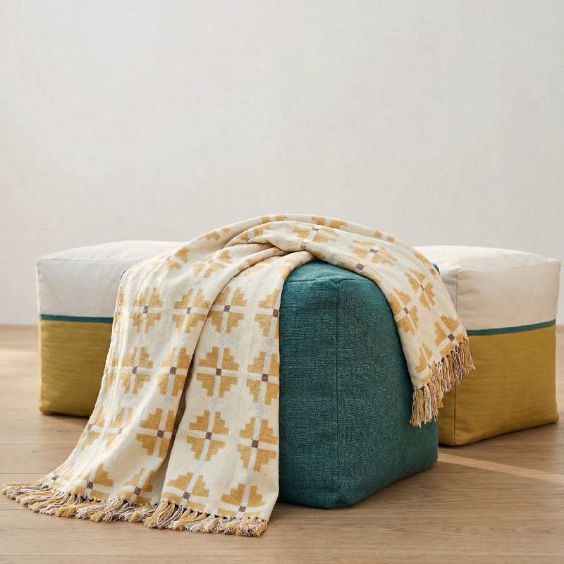 A modern upholstered pouf paired with a textured jacquard throw, designed to create a warm and inviting living space. The geometric pattern and soft neutral tones bring a balanced blend of comfort and contemporary style.